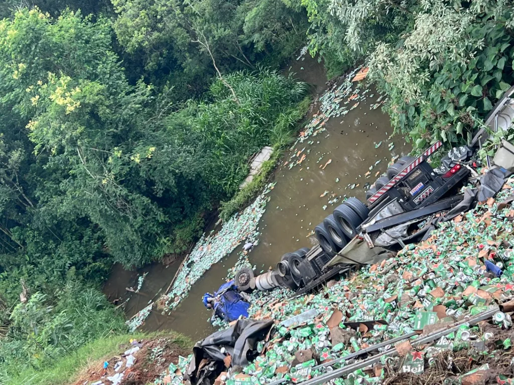 Segundo apuração do Blog do Berimbau, um caminhão carregado com bebidas, cujo semirreboque possui emplacamento de Ponta Grossa, saiu da pista e tombou em uma ribanceira, parando dentro de um rio às margens da rodovia. Com o impacto, a cabine do veículo ficou submersa na água.